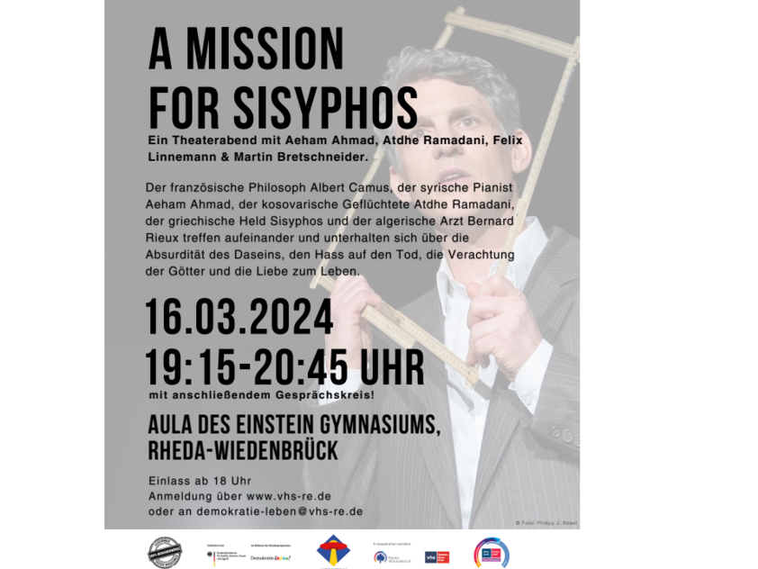 Am 16. März 2024 findet um 19.15 Uhr in der Aula des Einstein-Gymnasiums Rheda-Wiedenbrück der Theaterabend „A Mission for Sisyphos“ mit Aeham Ahmad, Atdhe Ramadani, Felix Linnemann und Martin Bretschneider statt.