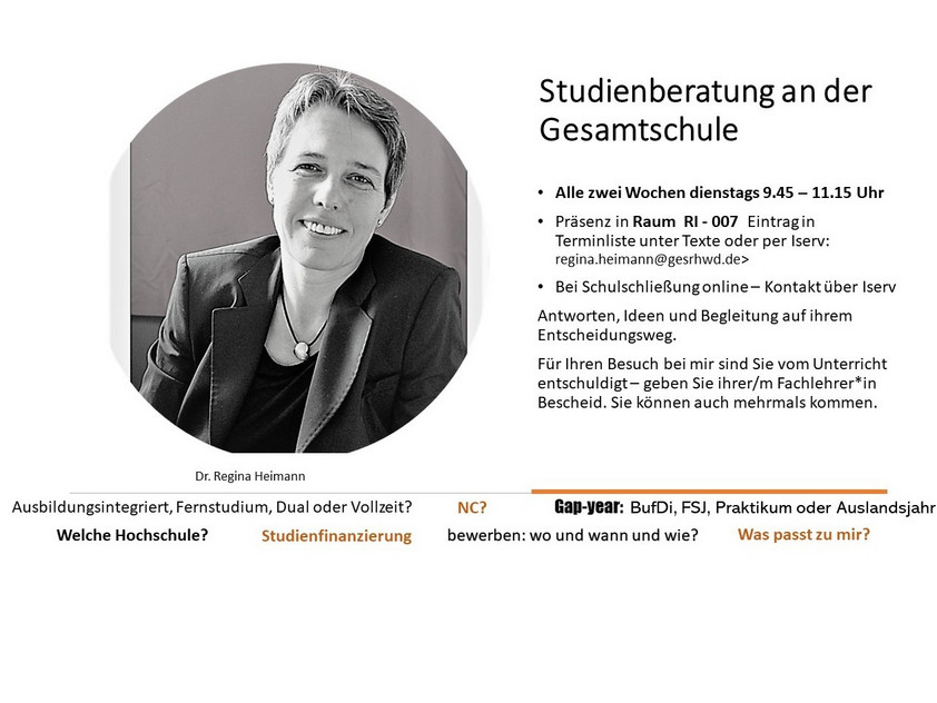 - Sie können das Angebot zu zweit oder auch mit den Eltern wahrnehmen. Eine Anmeldung in Iserv oder per mail regina.heimann@gesrhwd.de ist erforderlich